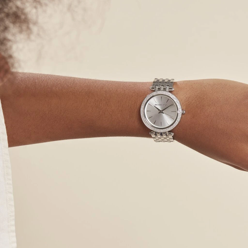 Cette montre Michael Kors vous donne un look chic. Elle sublime vos tenues les plus classiques aux plus branchées. C’est un modèle intemporel composé d’un boitier rond en acier et d’un bracelet de la même matière, le tout de couleur argentée. Son cadran à strass le rend encore plus attrayant. Cette montre est aussi proposée en acier doré et rose.