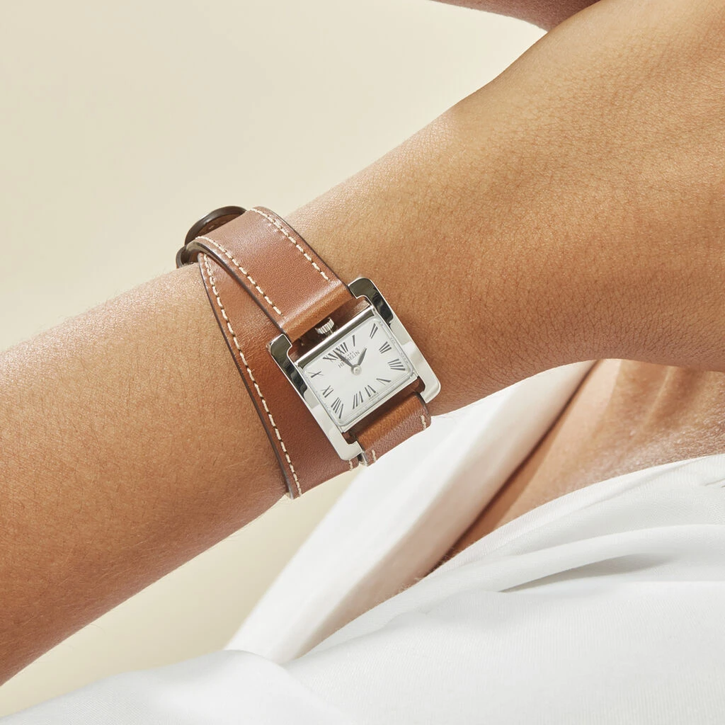 Montre Michel Herbelinem Avenue Acier Blanc Rectangulaire Quartz 22.5 X 17mm Fond Blanc Bracelet Cuir Marron 1703701ma