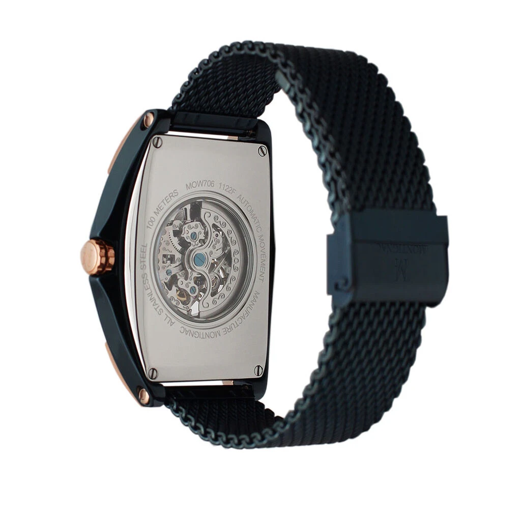 Montre Montignac Acier Noir Tonneau Automatique 59*45mm Fond Bleu Bracelet Acier Milanais Bleu Mow706
