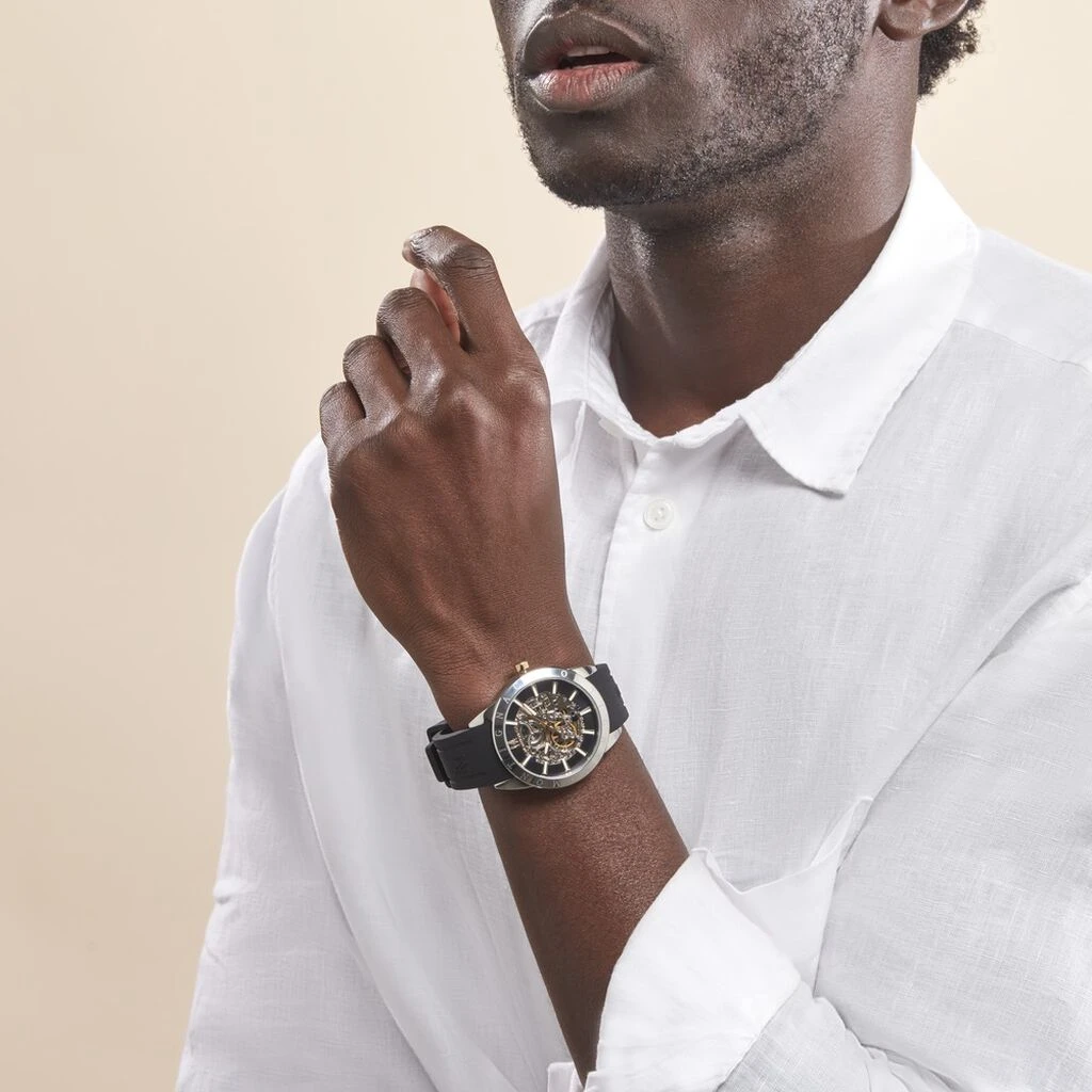 Montre Montignac Acier Argenté Ronde Automatique 44mm Fond Noir Bracelet Silicone Noir Mow508