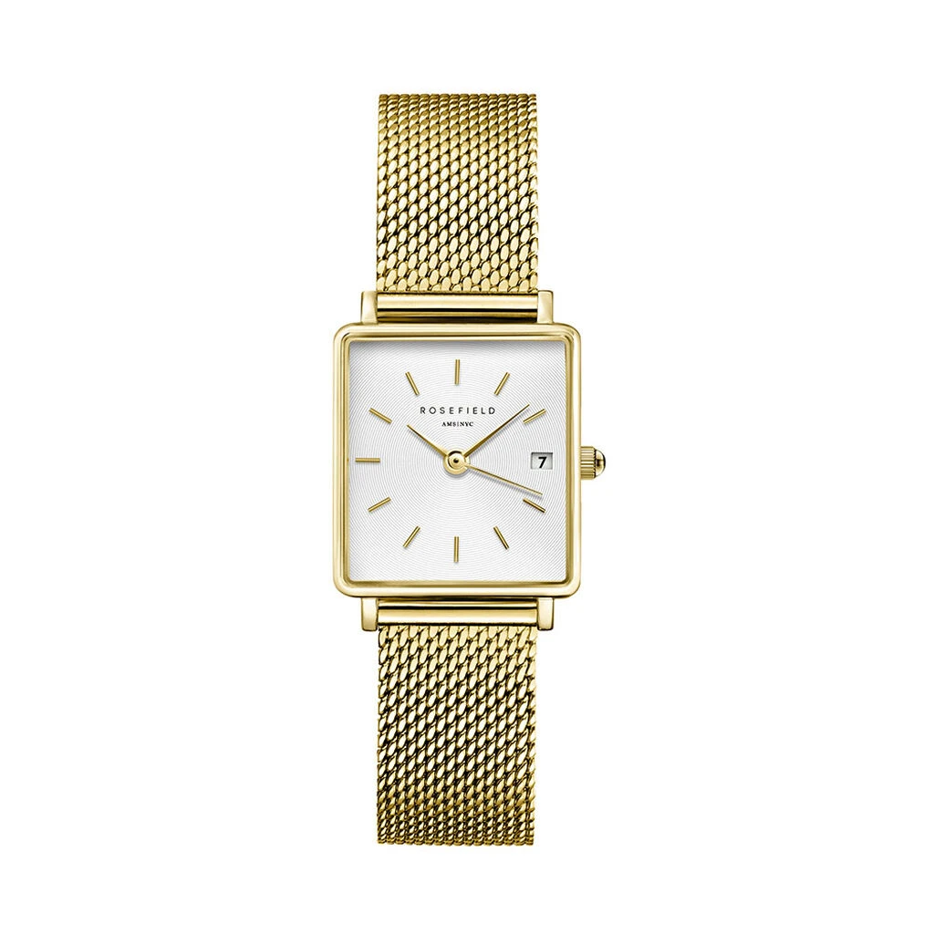 Montre Rosefield Boxy Xs Acier Doré Carré Quartz 22x24mm Fond Blanc Bracelet Milanais Acier Doré Qmwmg-q039