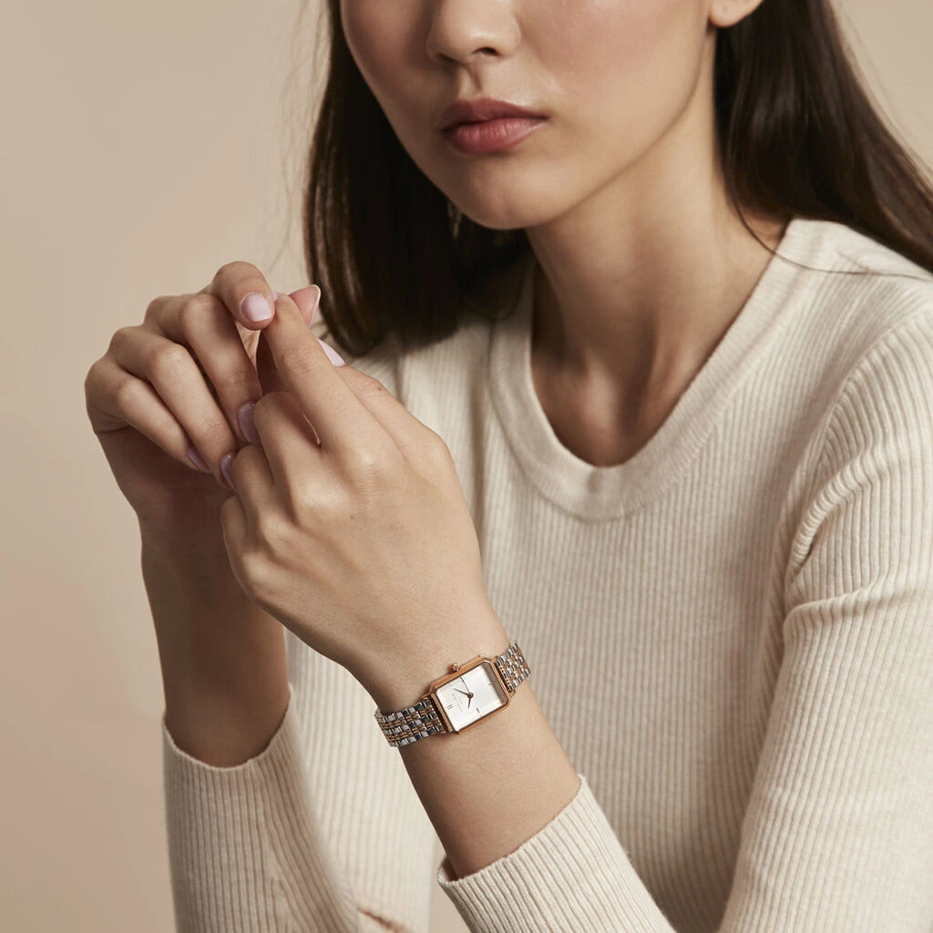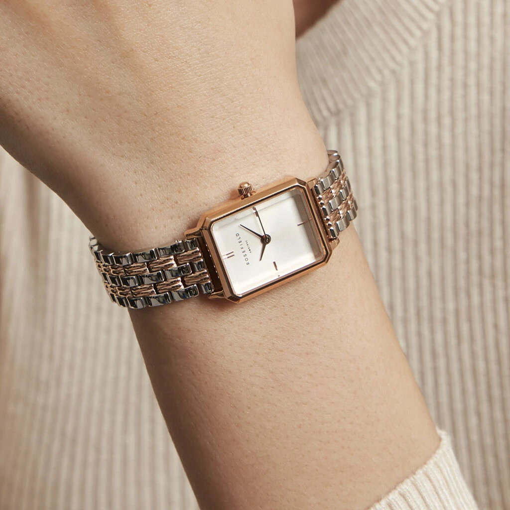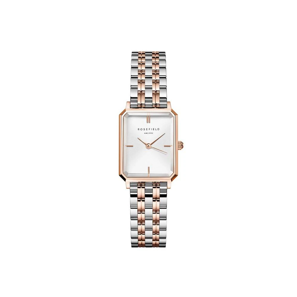 Montre Rosefield Octagon Xs Acier Doré Rose Rectangle Quartz 19.5x24mm Fond Blanc Bracelet Acier Bicolore Owrsr-o64