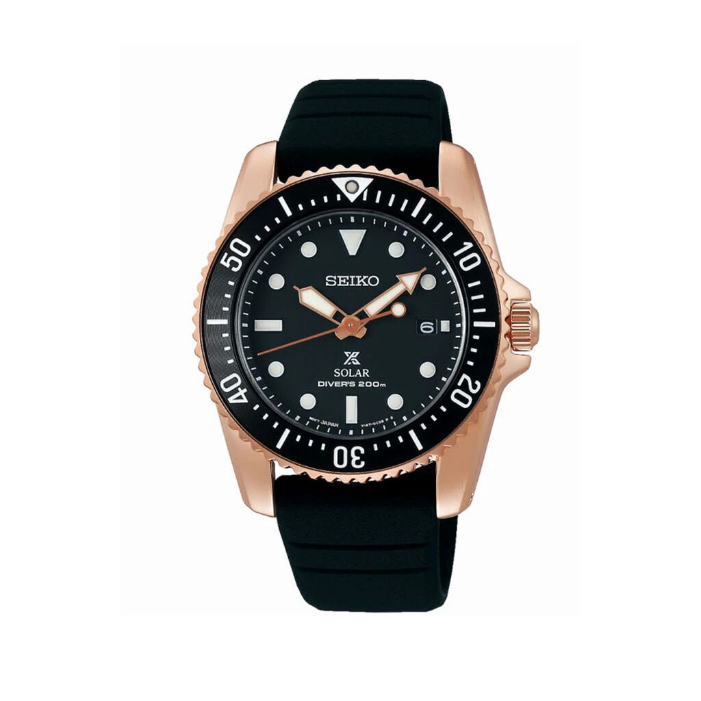 Montre Seiko Prospex Acier Rose Ronde Quartz Solaire 38.5mm Fond Noir Lunette Aluminium Noire Bracelet Silicone Noir Sne586p1
